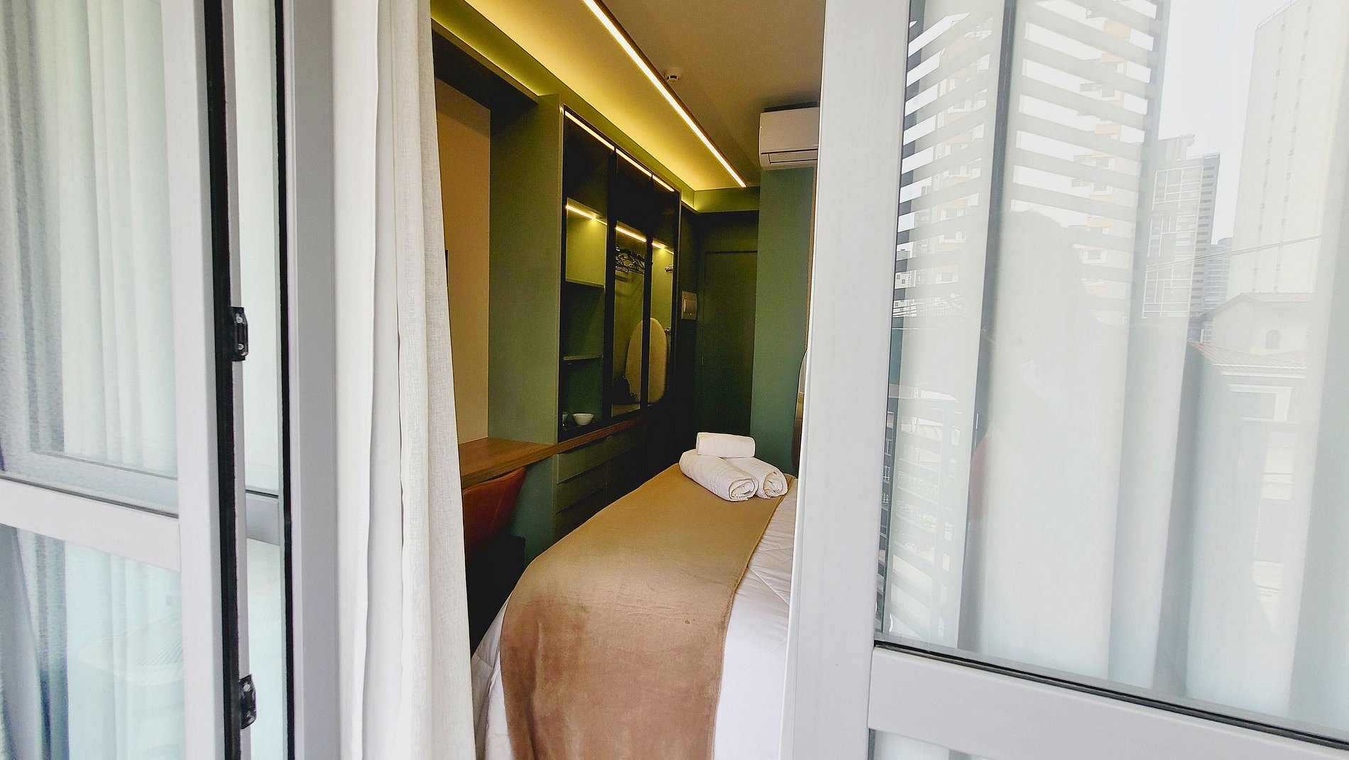 Além disso, o estúdio oferece uma sacada encantadora com vista urbana, onde você pode apreciar as luzes da cidade e sentir a energia do ambiente. É o local perfeito para desfrutar de um café da manhã ensolarado ou simplesmente contemplar o cenário urbano.