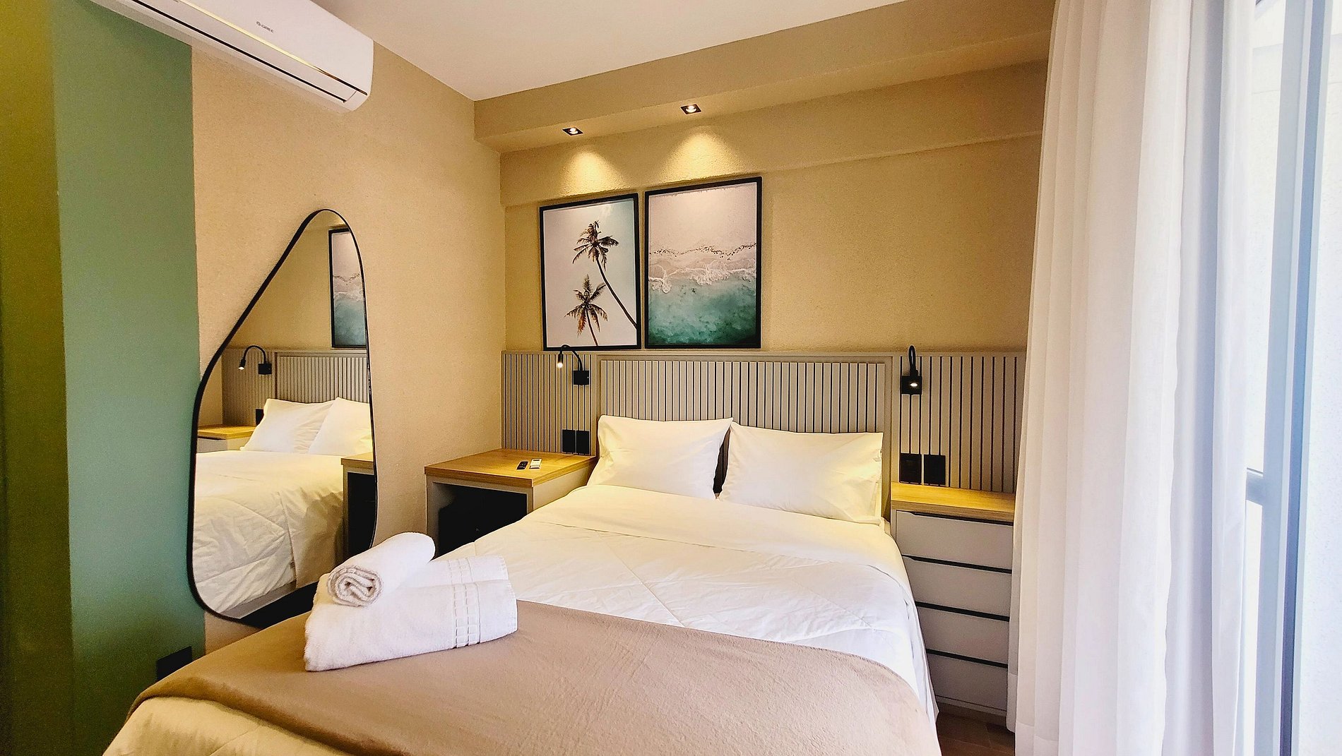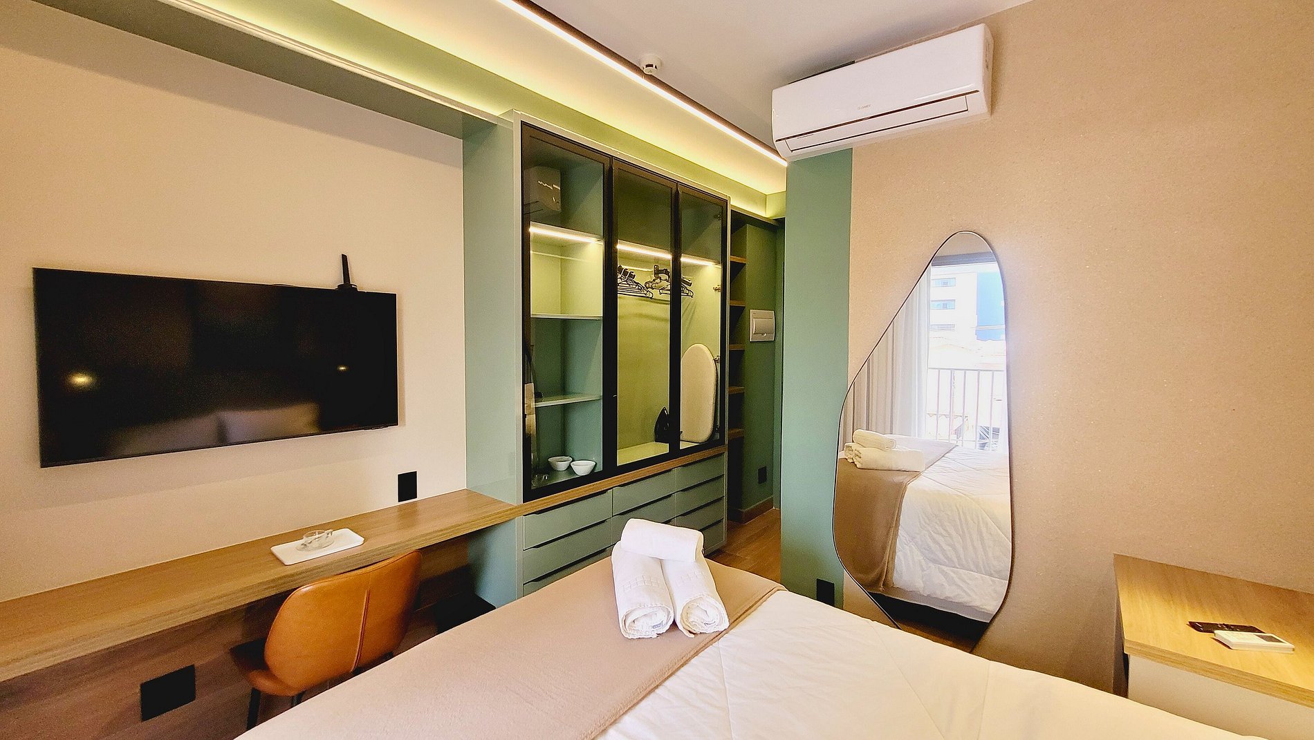 E para aqueles momentos em que você deseja se preparar para explorar a cidade, um espelho de corpo inteiro está à sua disposição, permitindo que você se arrume com facilidade e estilo.