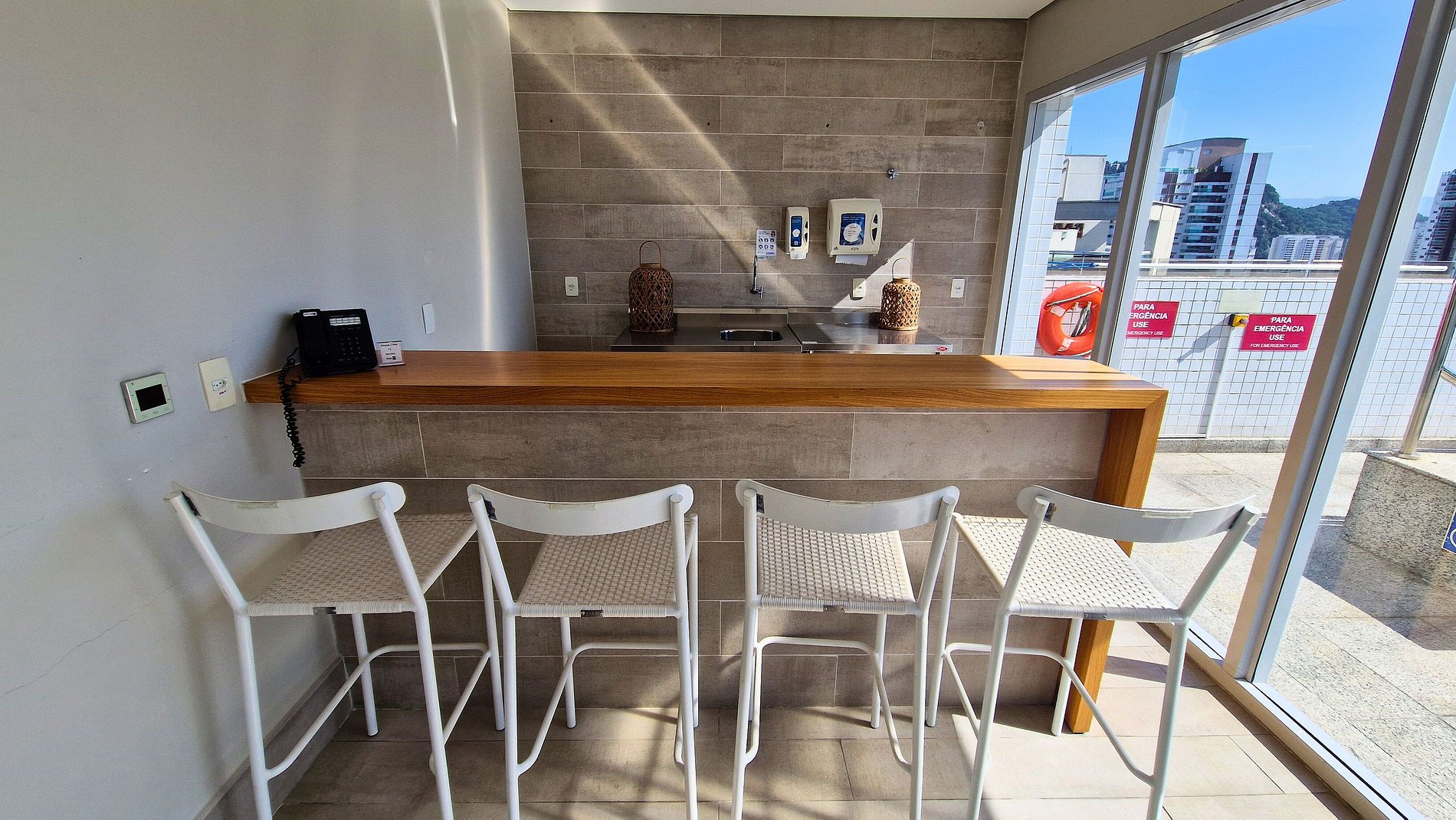 O condomínio Helbor Stay possui recepção 24h, estacionamento pago à parte com manobrista, piscina, academia, sauna para você relaxar após a praia ou após um dia de muito trabalho, além de contar com uma geladeira com bebidas e outros produtos para consumo imediato.