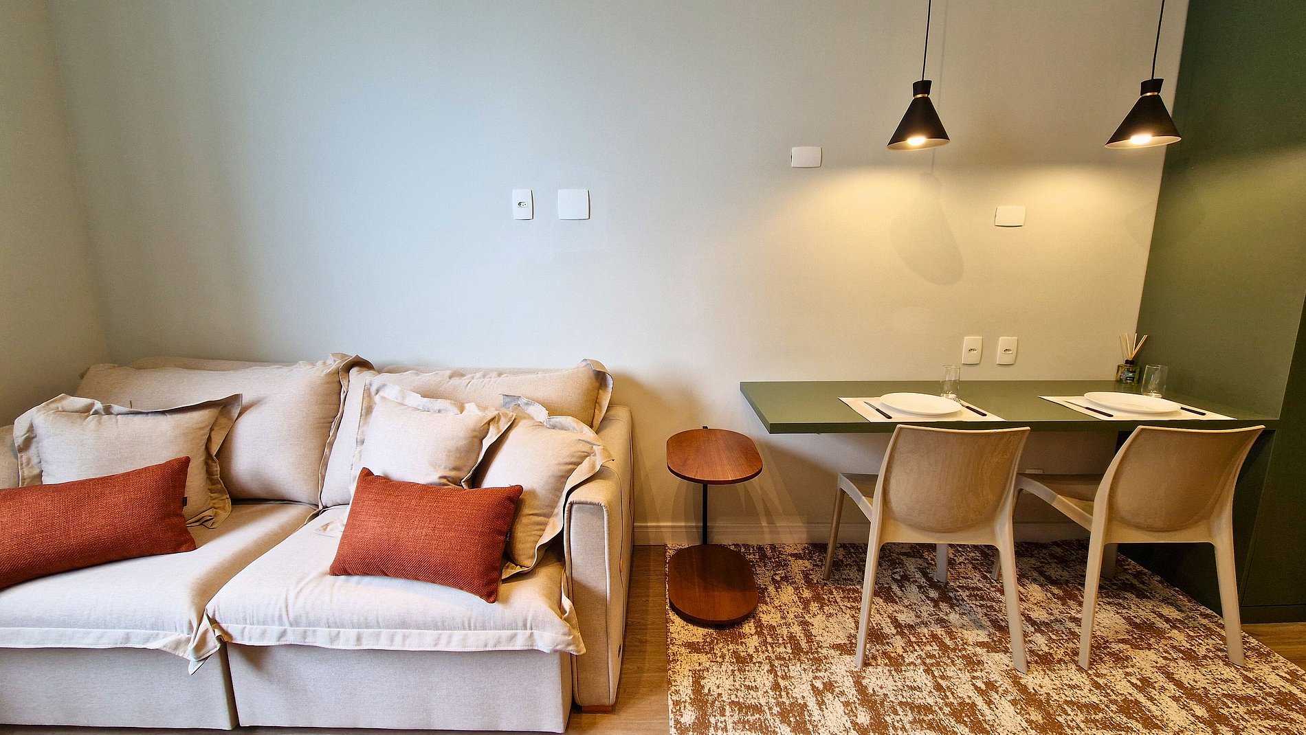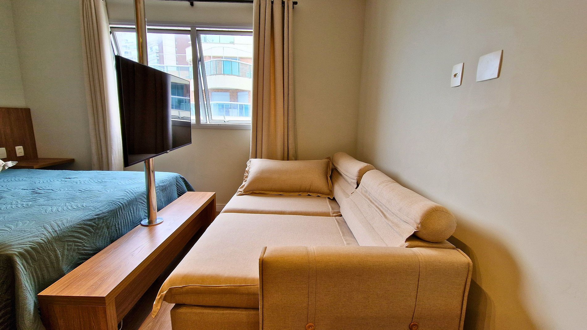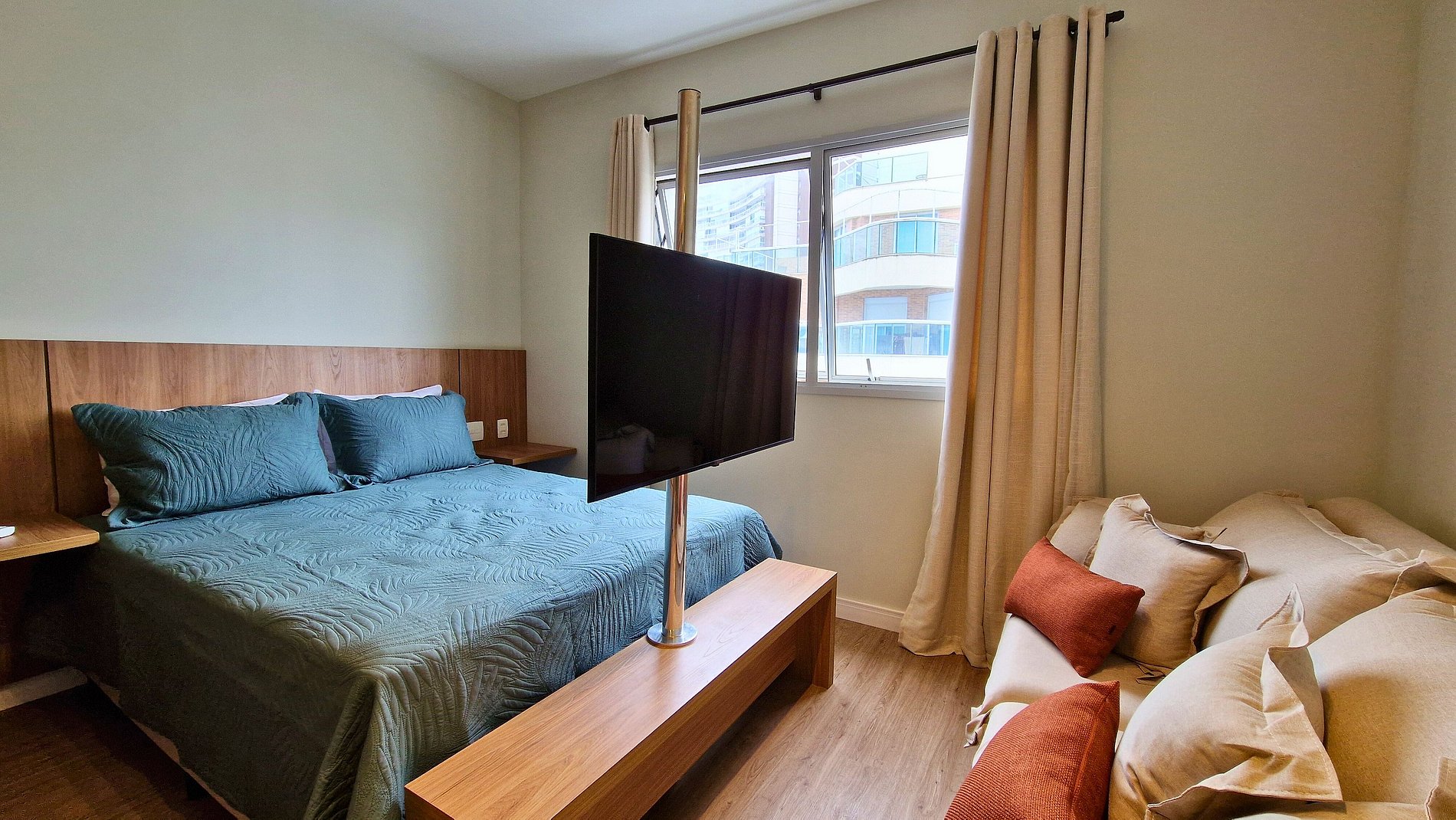 Ideal para casais ou famílias com uma criança pequena. Conta com cama de casal, sofá-cama 1,80x 1,05m, copa equipada (fogão, micro-ondas, frigobar, cafeteira), TV giratória e balcão para refeições.