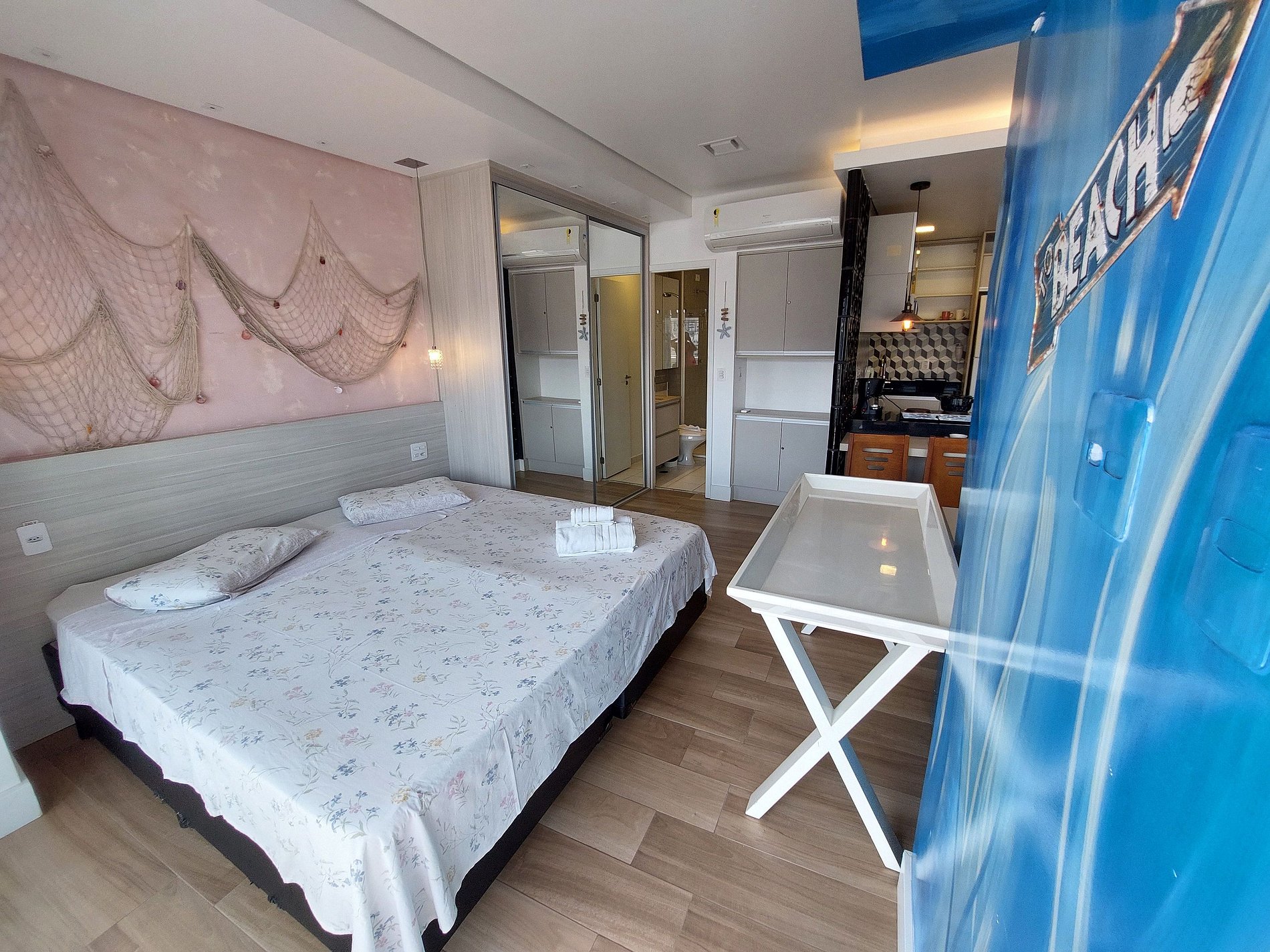 O apartamento 1413 possui vista para a piscina, tem sacada envidraçada e é perfeito para hospedagens com crianças, acomoda uma familia de até 4 pessoas. Também aceita cães de pequeno e médio porte pesando até 15kg mediante taxa adicional de R$ 120,00). Gatos não são aceitos.