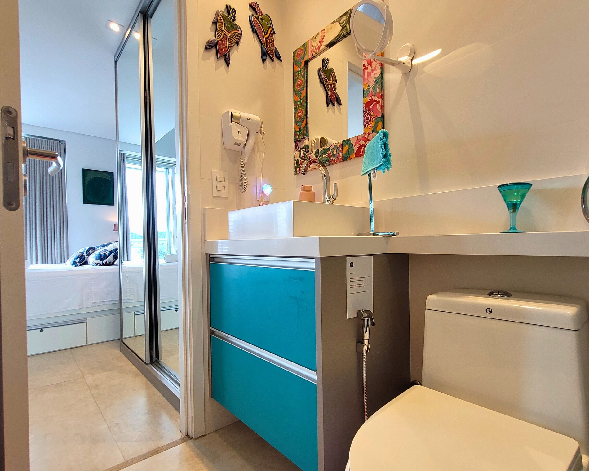 O espaço é indicado para casais e viajantes de negócios, há também um sofá de 1,75m² para o 3º hóspede. Com uma tv de 55" e som ambiente, com seus 49 m² com certeza vai te trazer momentos memoráveis no melhor condomínio de Santos!